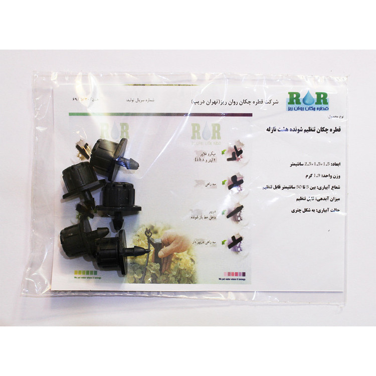 قطره چکان 8 نازله محصول شرکت قطره چکان روان ریز (تهران دریپ) همانند سایر قطرهچکانهای «روی خط» (online) بر روی لوله آبیاری پانچ میشود و کار آبرسانی را از این طریق انجام میدهد. این محصول علاوه بر باغهای بزرگ این قابلیت را دارد که باغچههای کوچک حیاط منازل مسکونی و حتی گلدانهایی را که دارای جایگاه ثابت هستند در صورت کارگذاری مناسب لولهها یا شلنگهای پلی اتیلن یا ... آبرسانی کند. بر لبههای تاج قطرهچکان 8 حفره برای عبور آب تعبیه شده است که باعث میشود آبیاری به صورت چتری و با نمایی چشمنواز انجام بگیرد. با تنظیم میزان آبدهی میتوان شعاع آبیاری را بین 5 تا 50 سانتیمتر تنظیم کرد. در میان انواع قطرهچکان موجود در بازار، قطرهچکان 8 نازله هزینه تمامشده پایینتر و در نتیجه قیمت پایینتری دارد و برای کسانی که علاوه بر کیفیت، قیمت کالا نیز عامل مؤثری در تصمیمشان برای خرید به شمار میرود انتخاب مناسبی خواهد بود.
