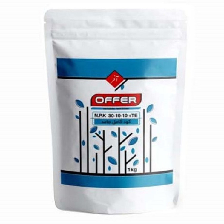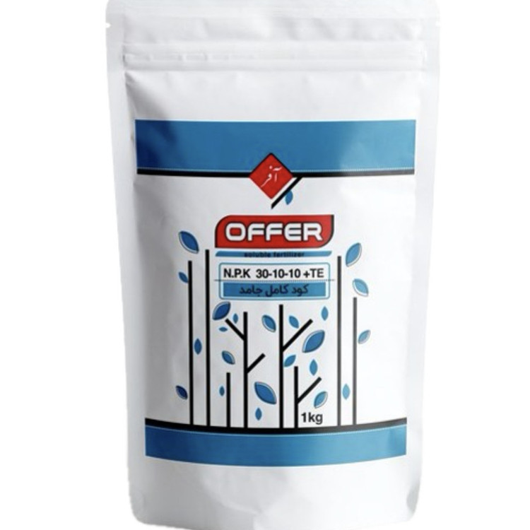 NPK 30 10 10 پودری حاوی 30% ازت،10% فسفات و10% پتاسیم و عناصر میکرو آهن، روی، منگنز و مس که همگی به فرم کلات EDTA کاملا پایدار، با درصد مناسب وعنصر بور که همگی محلول در آب می باشد. عناصرکم مصرف موجود در کود به فرم کلاته بوده به گونهای که بتواند کمبود تمام عناصر غذایی را بر طرف سازد. بنابراین کود فوق در مراحل آغاز رشد، میزان بالای نیتروژن مورد نیاز گیاه را فراهم مینماید.