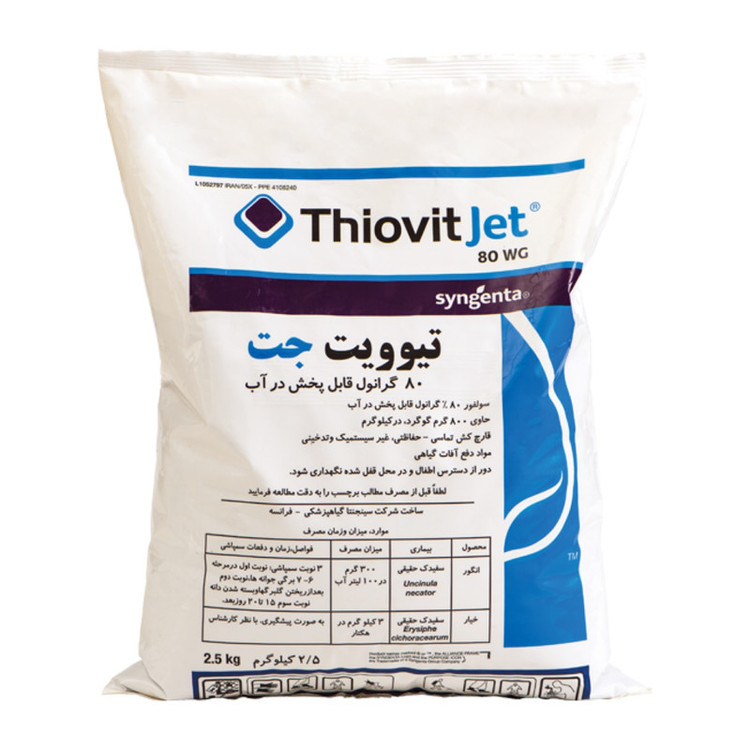 تیوویت جت قارچکشی تماسی – حفاظتی و غیرسیستمیک (تنها در تماس با سطح گیاه میتواند عامل بیماریزا را کنترل کند) با ۸۰ درصد گوگرد است. این قارچکش بهخاطر فرمولاسیونی که دارد وقتی روی سطح برگ محلولپاشی میشود یک لایه نازکی روی سطح برگ گیاه ایجاد میکند و بدین صورت باعث حفاظت گیاه در برابر ورود عوامل بیماریزا و آفات میشود. برای کنترل بیماریهایی مانند سفیدک سطحی و یکسری از حشرات ریز مثل کنهها میتوان از این محصول استفاده کرد همچنین بهعنوان برطرفکننده کمبود گوگرد در درختان هم استفاده میشود. توصیه میشود از کاربرد قارچکش تیوویت جت در گلخانههایی که در آنها از حشرات شکارگر استفاده میشود پرهیز شود. قارچکش تیوویت جت از نظر ماده مؤثره شبه کومولوس میباشد.